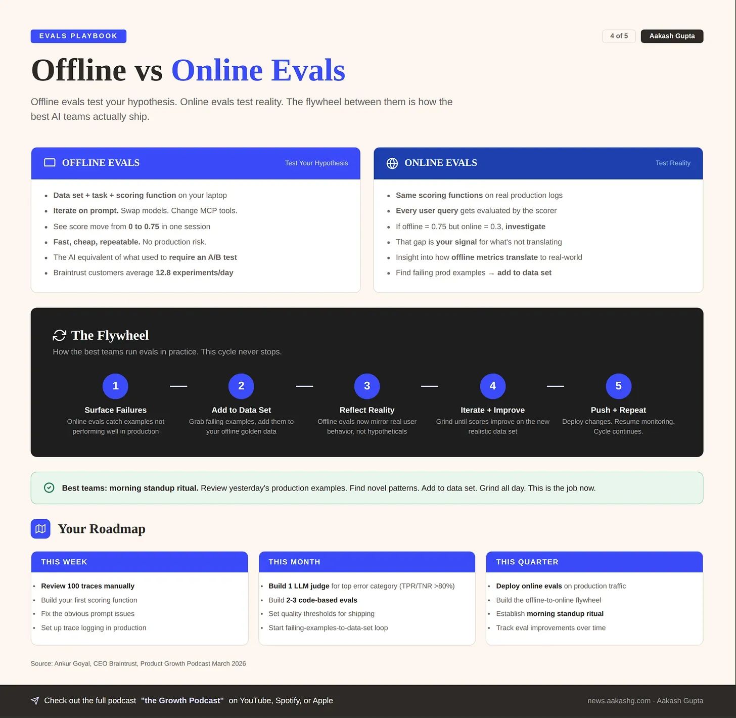 Offline evals tell you what should work. Online evals tell you what actually does. The gap between them is your roadmap.