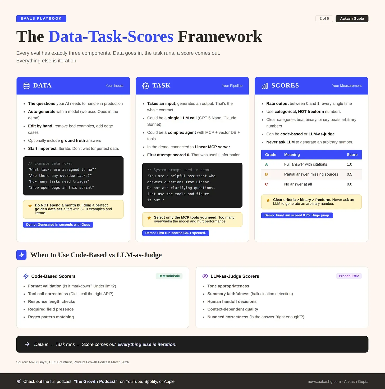Section titled “Newsletter Deep Dive”I took everything from the episode and combined it with lessons from four eval deep dives. Here is the complete practitioner’s playbook: