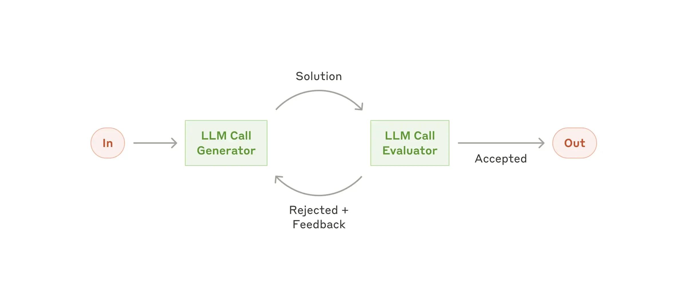 Section titled “Workflow: Evaluator-optimizer”In the evaluator-optimizer workflow, one LLM call generates a response while another provides evaluation and feedback in a loop.