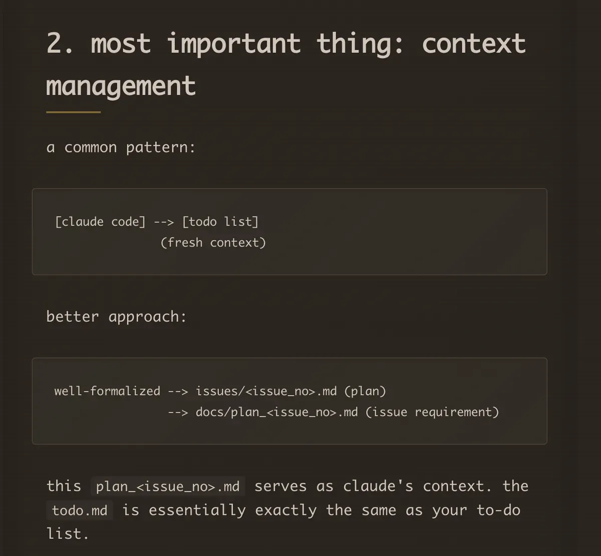 Section titled “Basic Context Management”If you use Claude Code, it will show X% until compaction happens. The moment I see that, I just start a new chat after - telling Claude to note down the important points in a file and then I will just start a new chat. I just intuitively feel it’s better to start a new chat.