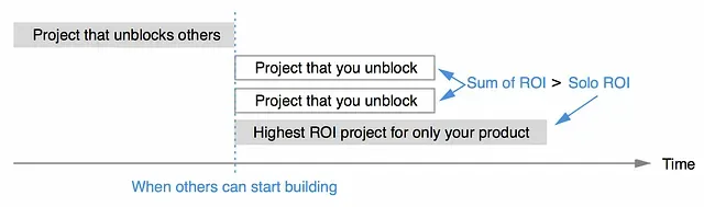 If you’re optimizing for the company’s ROI above your product’s— which you should be — you’ll now need to assess the ==cumulative ROI of not just your project, but the dependent projects that you unblock in order to make the correct prioritization decision for your team.==