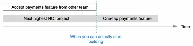 However, to do that, your company actually needs to have the ability to accept payments in the first place, which another team is working on now. The dependency on the other team finishing means you can’t really do anything yet, so the correct prioritization decision is to delay the one-tap feature and do your next highest ROI project.