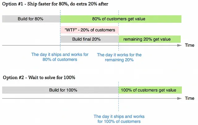 As an example, a difficult choice product teams often face is whether or not to ship a feature early to 80% of the customer base, while delaying the feature for the last 20%. This choice typically arises when building the final 20% requires a lot of niche functionality, which takes double the time to build (as the first 80%).
