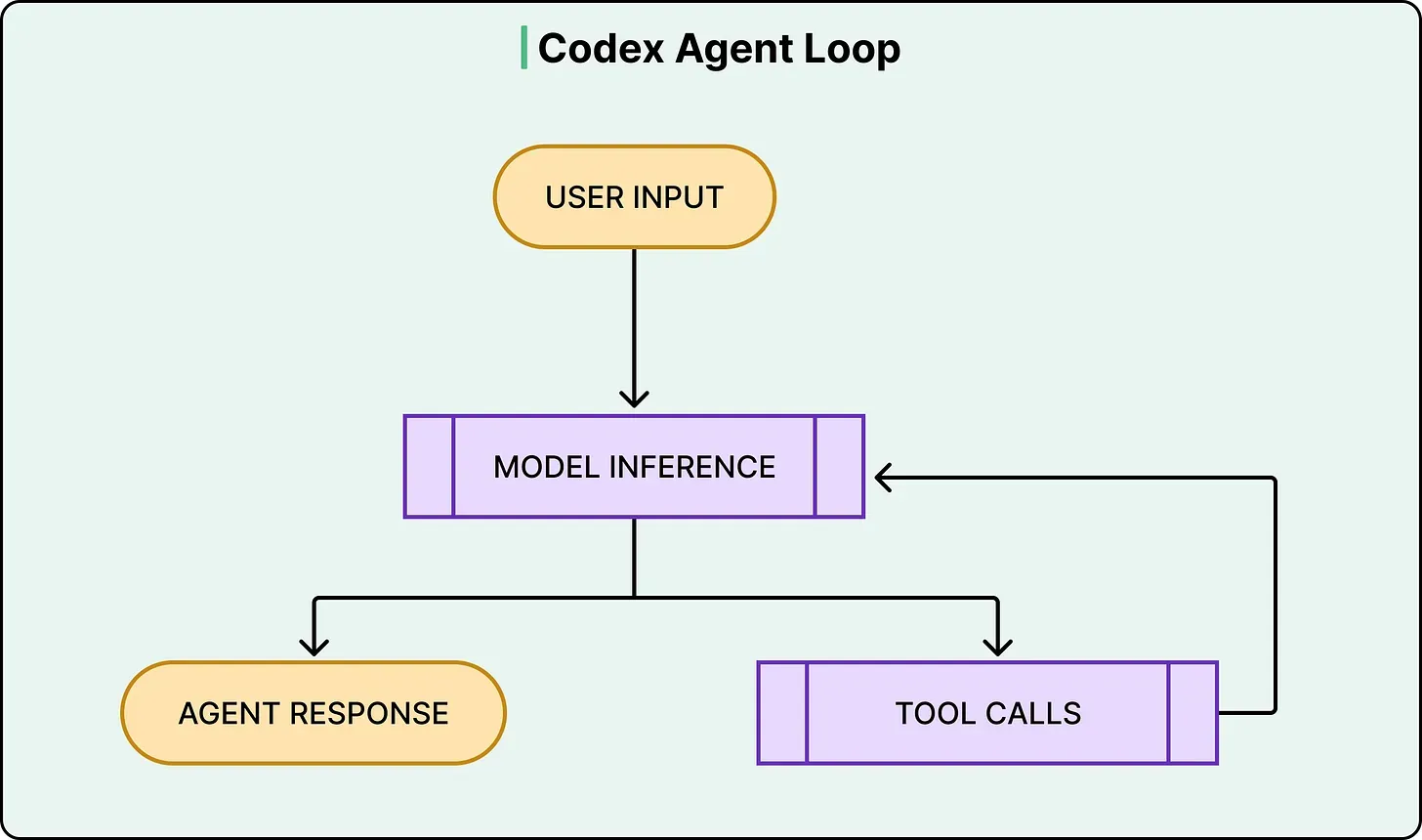 Section titled “The Agent Loop”At the heart of Codex is something called the agent loop. The agent takes user input, constructs a prompt, sends it to the model for inference, and gets back a response.
