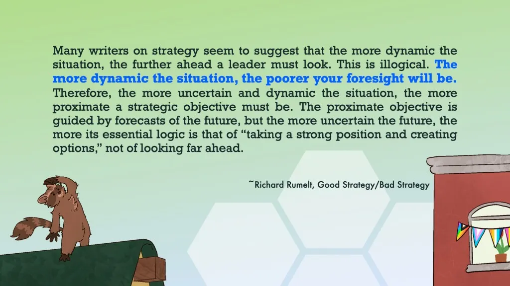 Many writers on strategy seem to suggest that the more dynamic the situation, the further ahead a leader must look. This is illogical. The more dynamic the situation, the poorer your foresight will be. Therefore, the more uncertain and dynamic the situation, the more proximate a strategic objective must be. The proximate objective is guided by forecasts of the future, but the more uncertain the future, the more its essential logic is that of “taking a strong position and creating options,” not of looking far ahead. ~Richard Rumelt, Good Strategy/Bad Strategy