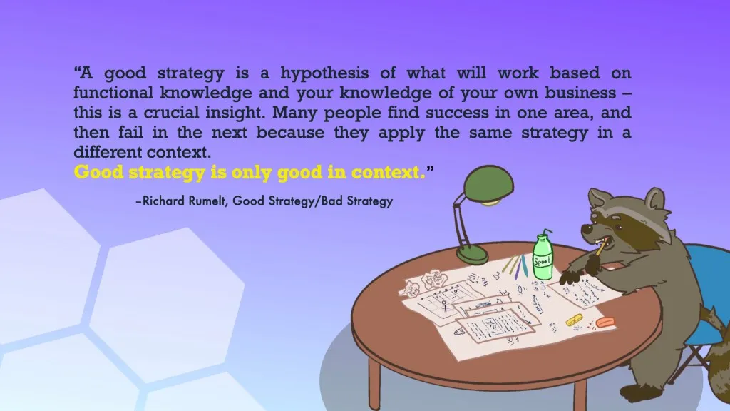 “A good strategy is a hypothesis of what will work based on functional knowledge and your knowledge of your own business – this is a crucial insight. Many people find success in one area, and then fail in the next because they apply the same strategy in a different context. Good strategy is only good in context.” –Richard Rumelt, Good Strategy/Bad Strategy