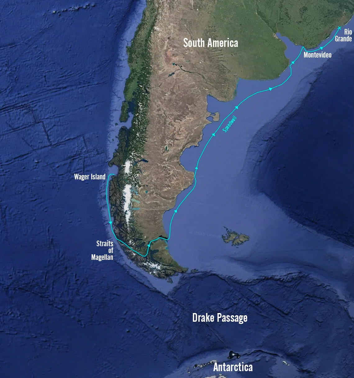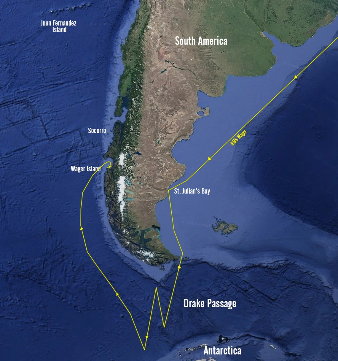 A rough approximation of the route of HMS Wager