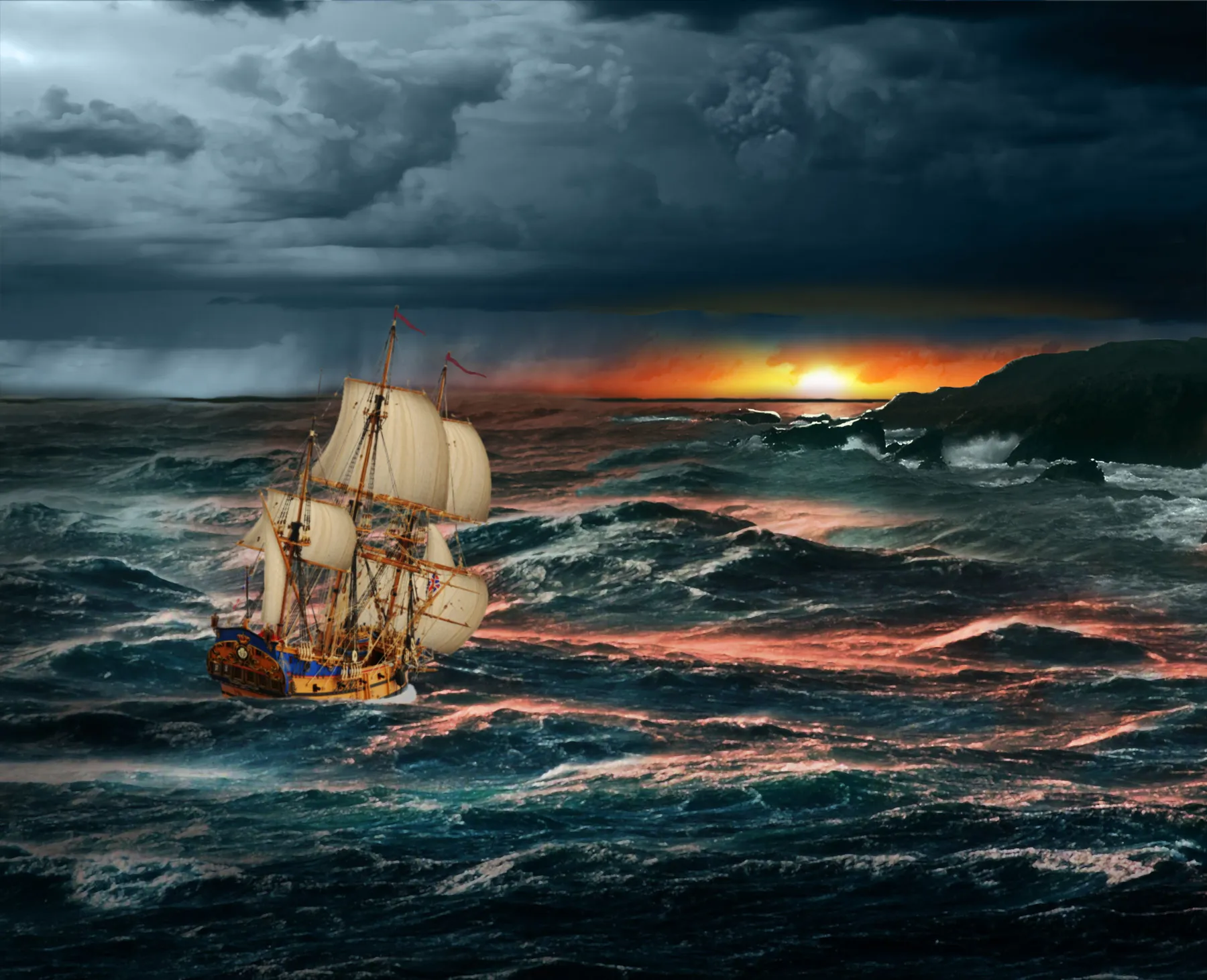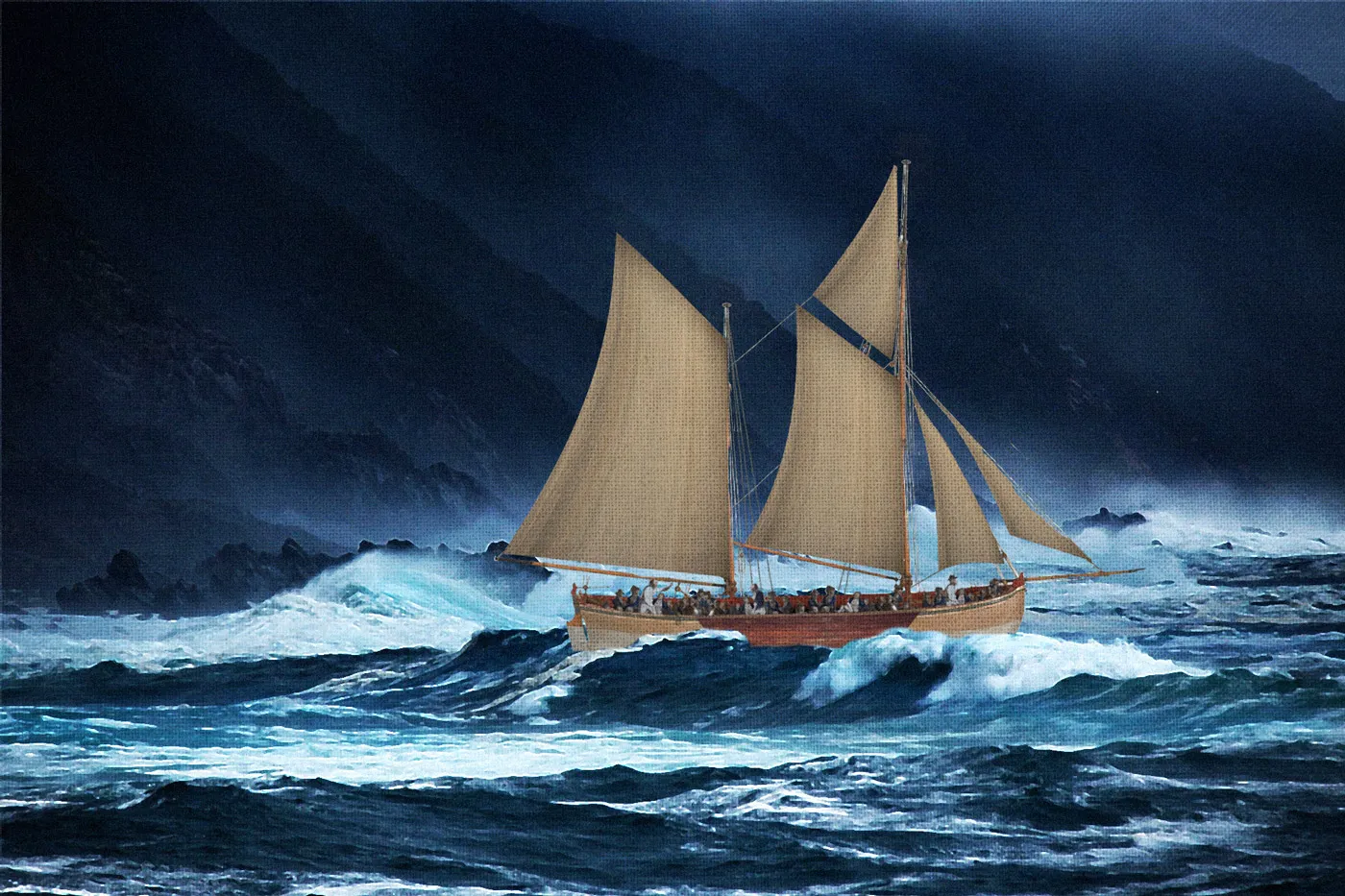The effort continued until after sundown. A dense cover of clouds crowded the sky and smothered the moon, hiding the looming shore from view. The men had altered Wager’s course, but it was impossible to know whether they had turned far enough. Gusts of wind agitated the ocean and pushed Wager through the cold darkness. Heavy raindrops pelted the deck. The ship full of ailing conscripts teeter-tottered blindly through writhing seas.