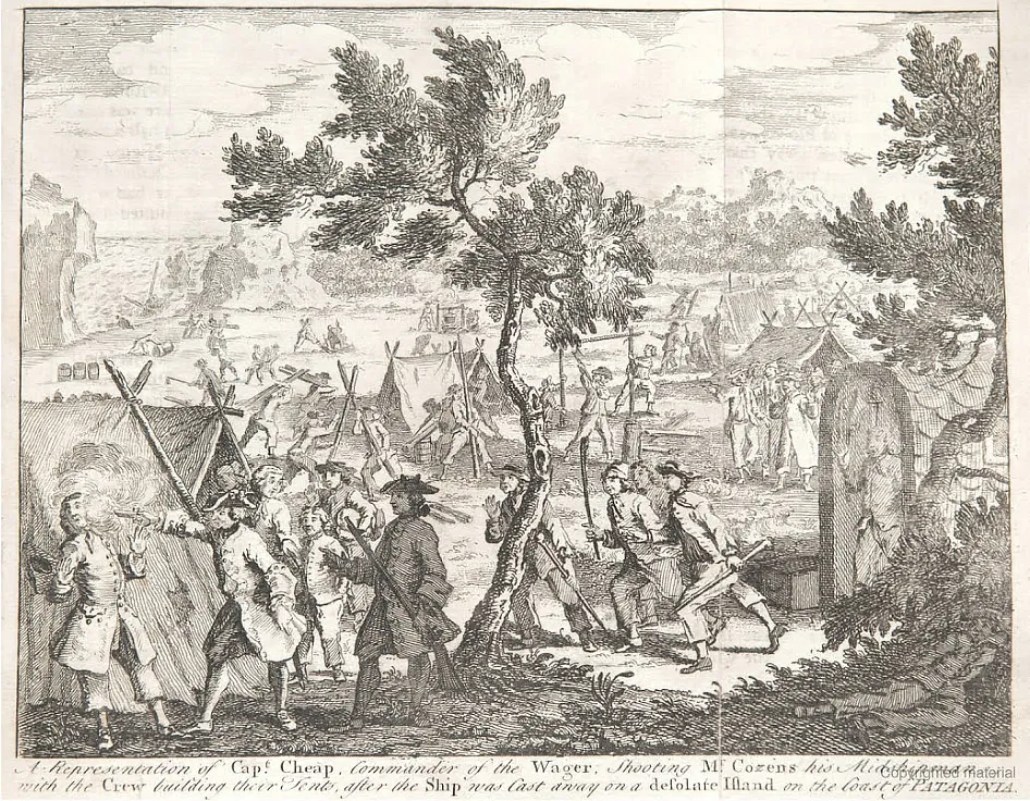 “A Representation of Cap. Cheap, Commander of the Wager, Shooting Mr. Cozens his Midshipman with the Crew building their Tents after the Ship was Cast away on a desolate Island on the Coast of Patagonia”