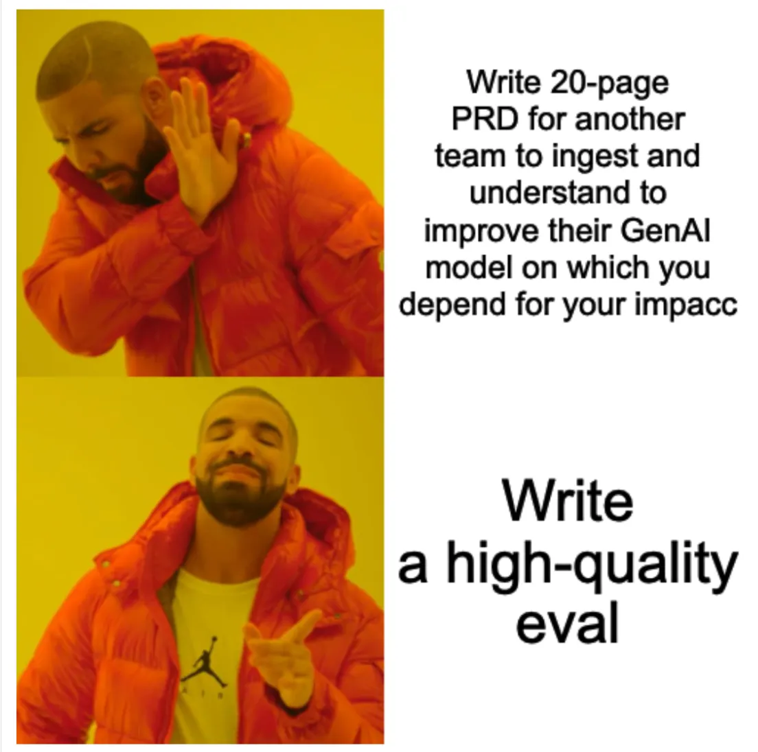 My day job is on the Llama PM team. When a partner team wants Llama to do something, I ask them to please not send me a product spec or PRD or description of the problem. This just adds additional work for the team to parse and understand. Cut the middleman and send me an eval directly. And the magical thing is that anyone can do this.