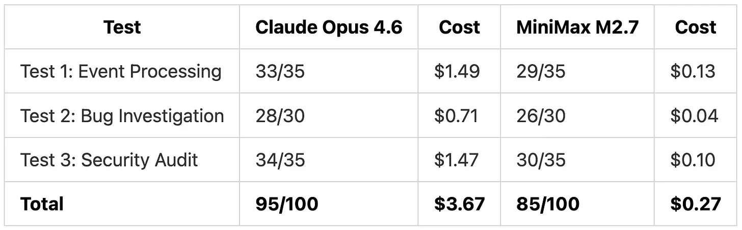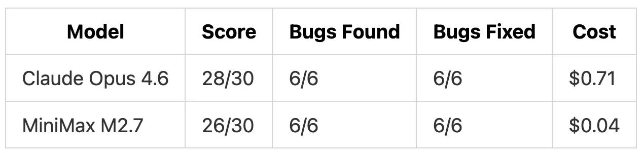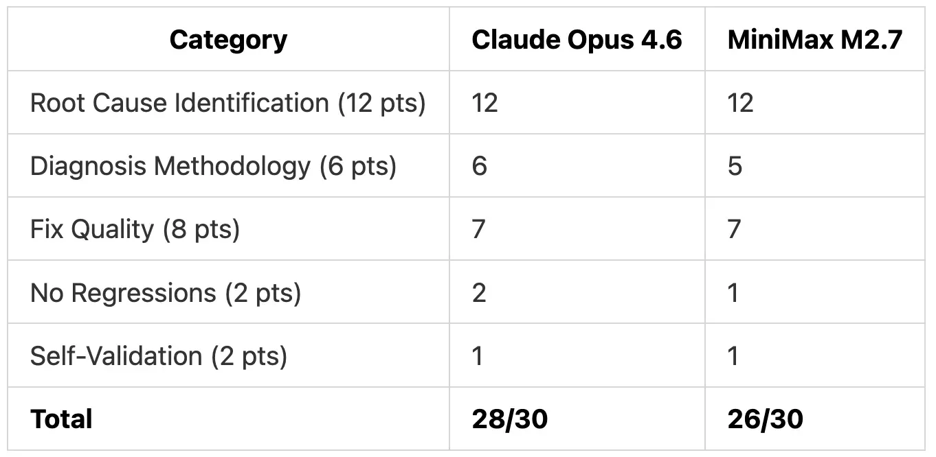 For debugging: Both models found all 6 root causes from log symptoms. MiniMax M2.7 even produced a better fix for the floating-point bug. Claude Opus 4.6 added rollback logic that MiniMax M2.7 missed.