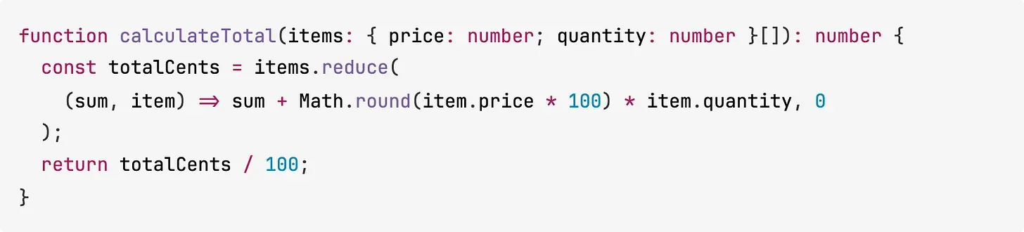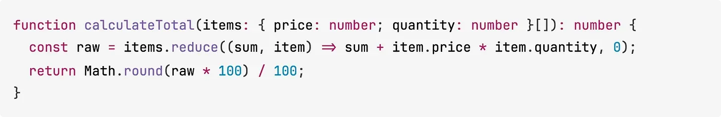 Section titled “Bug #4: Floating-Point Totals”The order total calculation used standard floating-point arithmetic, which produces results like 159.92000000000002 for certain price and quantity combinations. The logs showed repeated “Total validation warning” entries where the expected and calculated totals differed by tiny fractions.