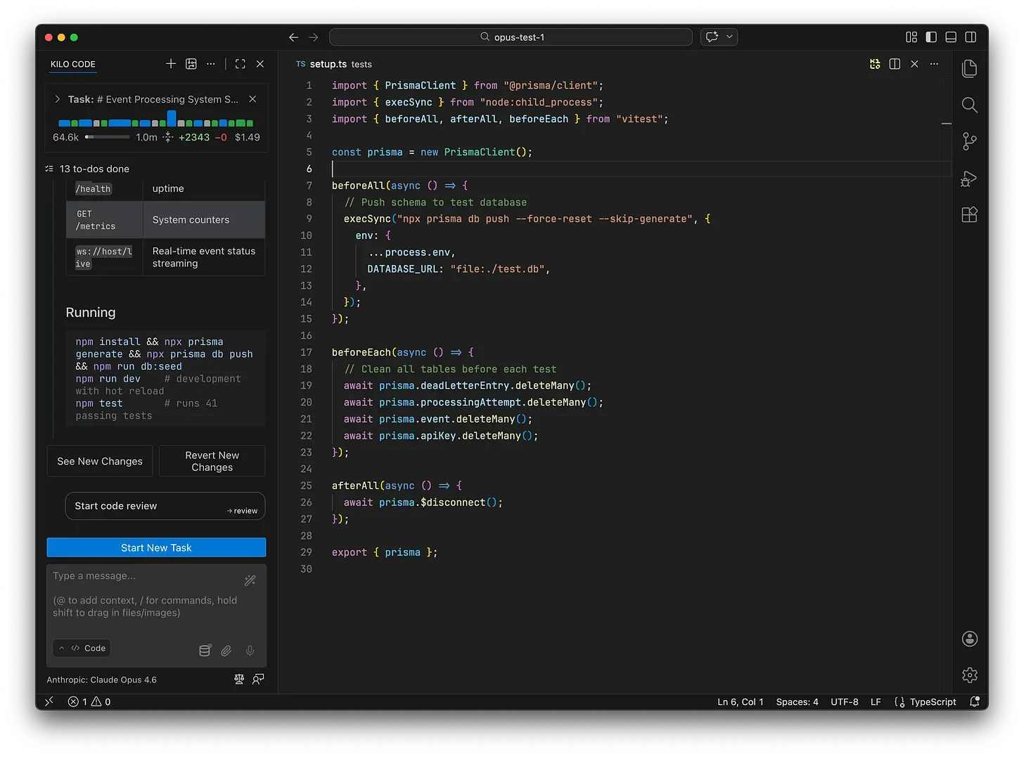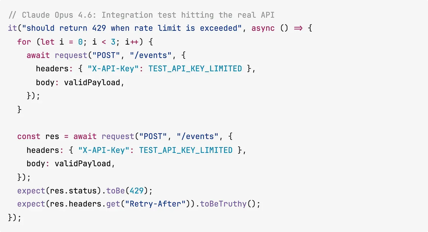 Section titled “Test Coverage”Claude Opus 4.6 wrote 41 integration tests with a dedicated test database and proper cleanup between tests. The tests make actual HTTP requests against the API, testing the full middleware chain end-to-end.