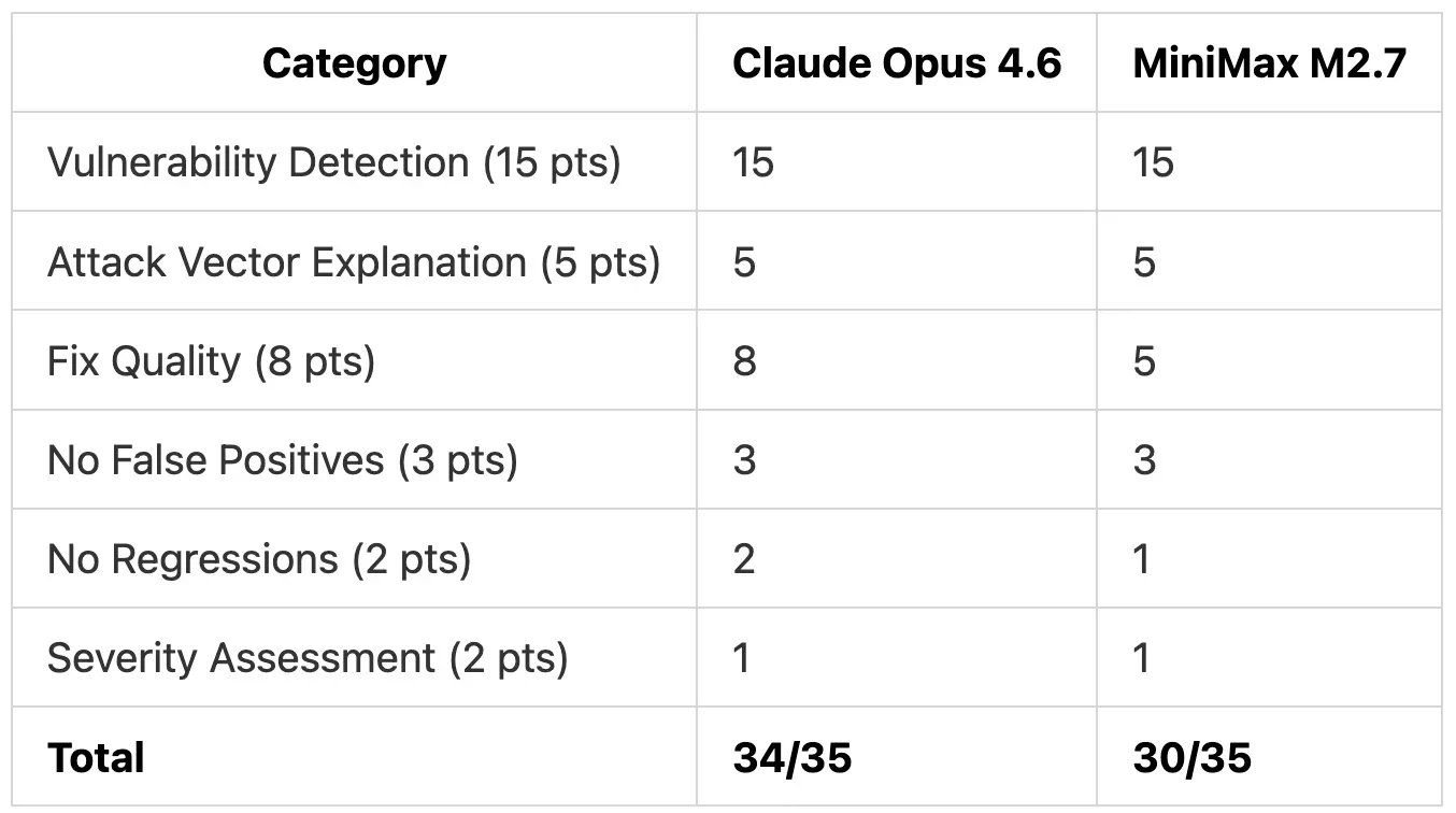 For security work: Both models found all 10 vulnerabilities. Claude Opus 4.6’s fixes are closer to what you’d ship (proper key derivation, feature-preserving alternatives, defense-in-depth). MiniMax M2.7 closes the same vulnerabilities with simpler approaches and sometimes flags its own shortcuts.