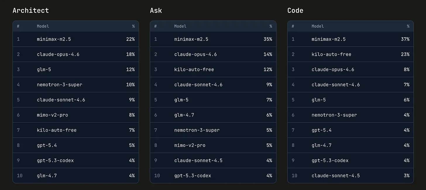 Section titled “The Bigger Picture”We’ve been testing MiniMax models since M2 last November. Earlier versions competed against other open-weight models like GLM 4.7 and GLM-5. With each release, the scores climbed and the cost stayed low. MiniMax M2.5 (the previous version) is currently the #1 most-used model across every mode in Kilo Code, ahead of Claude Opus 4.6, GLM-5, and GPT-5.4. In Code mode it accounts for 37% of all usage. In Ask mode, 35%.
