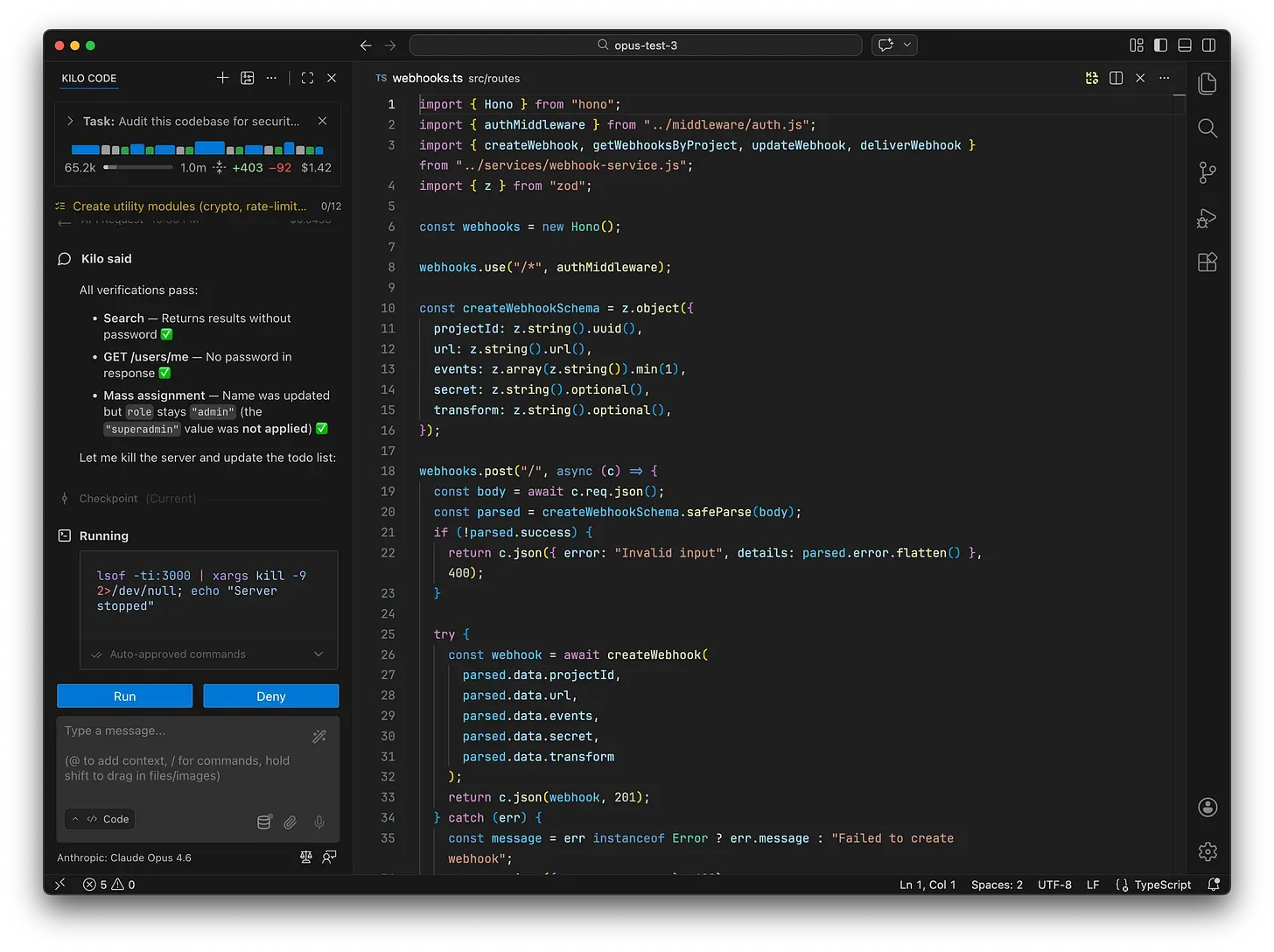 Section titled “Test 3: Security Audit”We built a team collaboration API (Hono + Prisma + SQLite) with 10 planted security vulnerabilities. We asked both models to audit the codebase, categorize each vulnerability by OWASP, explain the attack vector, rate severity, and implement fixes.