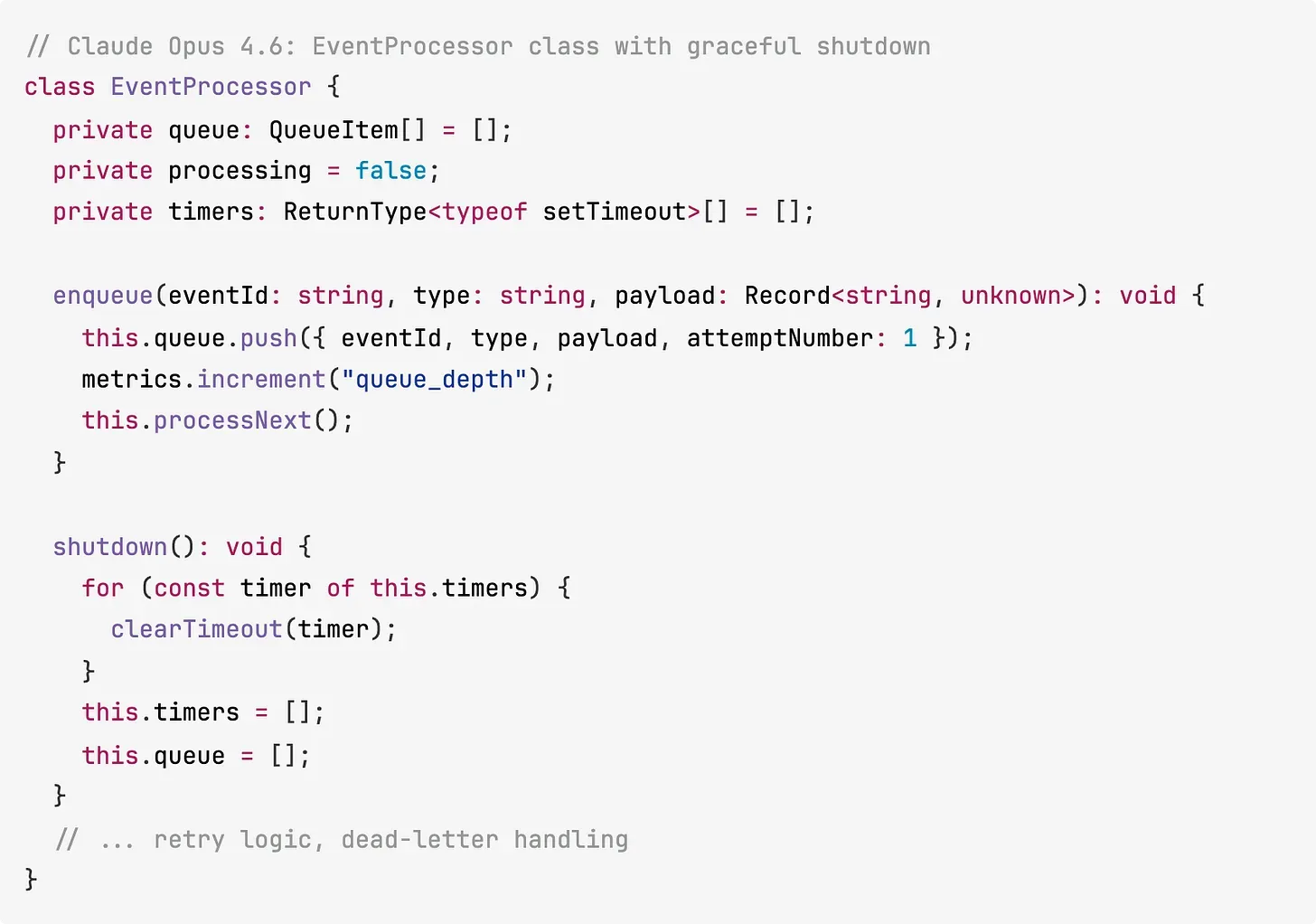Section titled “Architecture”Claude Opus 4.6 created a modular directory structure with separate directories for routes, pipeline, middleware, and WebSocket management. It split the processing logic into separate files for queue management (with retry scheduling and dead-letter routing) and per-type event handlers. It also included graceful shutdown with timer cleanup.