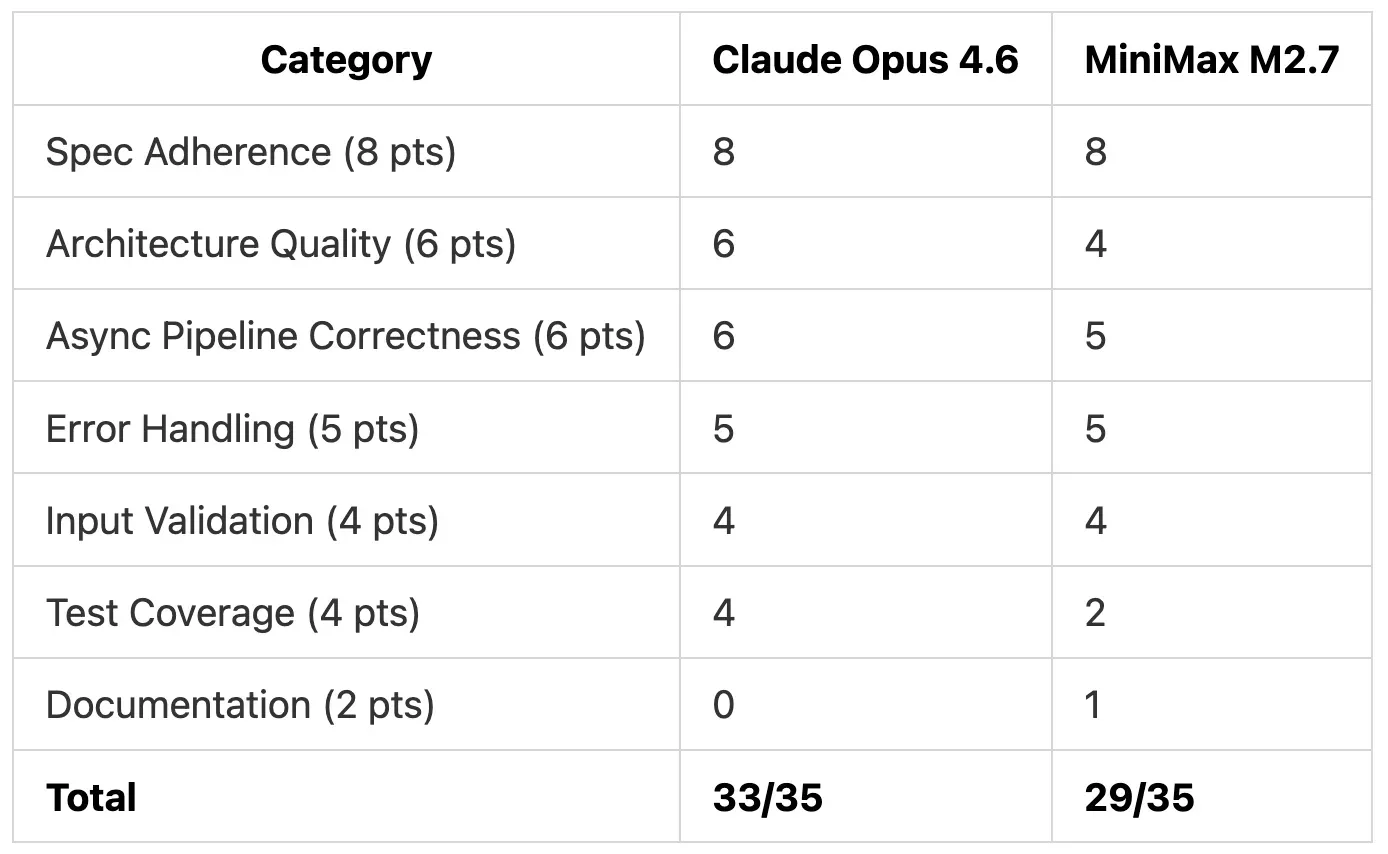 Claude Opus 4.6 lost 2 points for not generating a README (the spec asked for one). MiniMax M2.7 generated a README but lost points on architecture and test coverage.