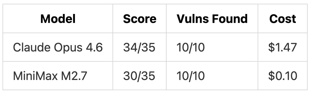 MiniMax M2.7 is the first version where we felt the right comparison was a frontier model rather than another open-weight one. It matched Claude Opus 4.6’s detection rate on every test in this benchmark, finding the same bugs and the same vulnerabilities. The fixes aren’t as thorough yet, but the diagnostic gap between open-weight and frontier models is shrinking with every release.