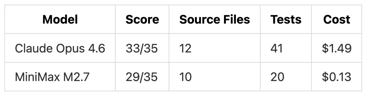 Section titled “Takeaways”For building from scratch: Claude Opus 4.6 produced 41 integration tests and a modular architecture. MiniMax M2.7 built the same features with 20 unit tests and a flatter structure, at $0.13 vs $1.49.