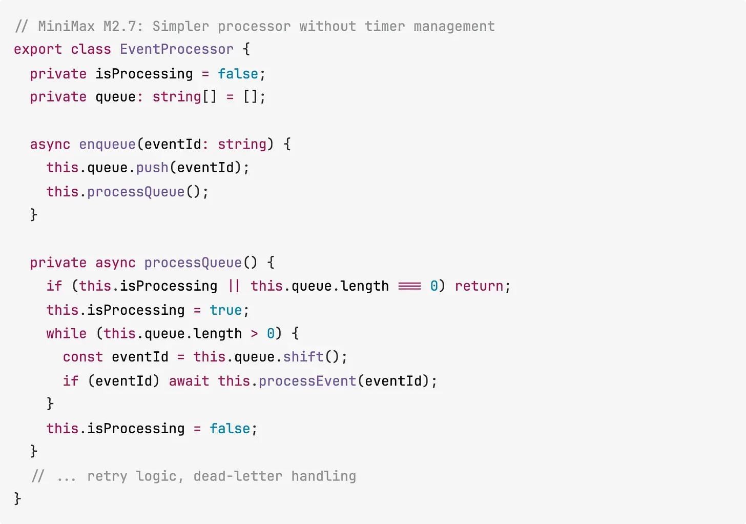 MiniMax M2.7 used a flatter structure with fewer files. All routing lived in a single entry file, and the processor was simpler with no shutdown management or timer tracking.