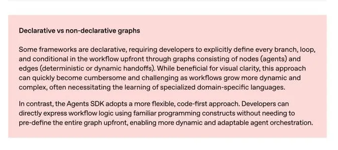 LangGraph is not fully declarative - but it’s declarative enough so that’s not my main gripe. My main gripe would be that “non-declarative” is doing a lot of work and misleading. Normally when people criticize declarative frameworks they would prefer a more imperative framework. But Agents SDK is NOT an imperative framework. It’s an abstraction. A more proper title would be “Declarative vs imperative” or “Do you need an orchestration framework” or “Why agent abstractions are all you need” or “Workflows vs Agents” depending on what they want to argue (they seem to argue both below).