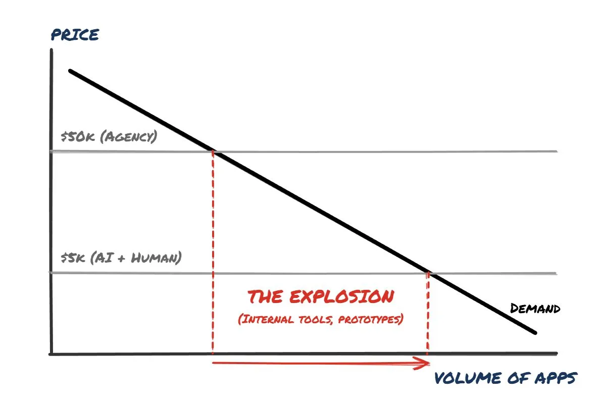 If we apply this to software engineering, think of supply and demand. There is so much latent demand for software. I’m sure every organisation has hundreds if not thousands of Excel sheets tracking important business processes that would be far better off as a SaaS app. Let’s say they get a quote from an agency to build one into an app for 5k (for a decent developer + AI tooling) - suddenly there is far more demand.