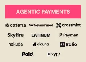 A growing set of tools is emerging to support agentic commerce and finance: Catena Labs and Skyfire both pair identity with payments (via ACK-ID and KYApay respectively), though Catena positions as an AI-native financial institution while Skyfire emphasises programmatic buyer-seller interactions. Payman enables traditional banks to offer intent-driven, agentic money movement that listens for user cues and optimises tradeoffs to pursue outcomes users want (e.g. maximise returns, preserve liquidity, ensure no payments are missed). Paid, Nevermined, and Alguna focus on monetising agents through automated billing, pricing models, and ROI/cost tracking, while Crossmint enables agents to buy products via agentic checkout and programmable wallet. In similar vein, Vypr is focused on agentic commerce (though it works via context portability).