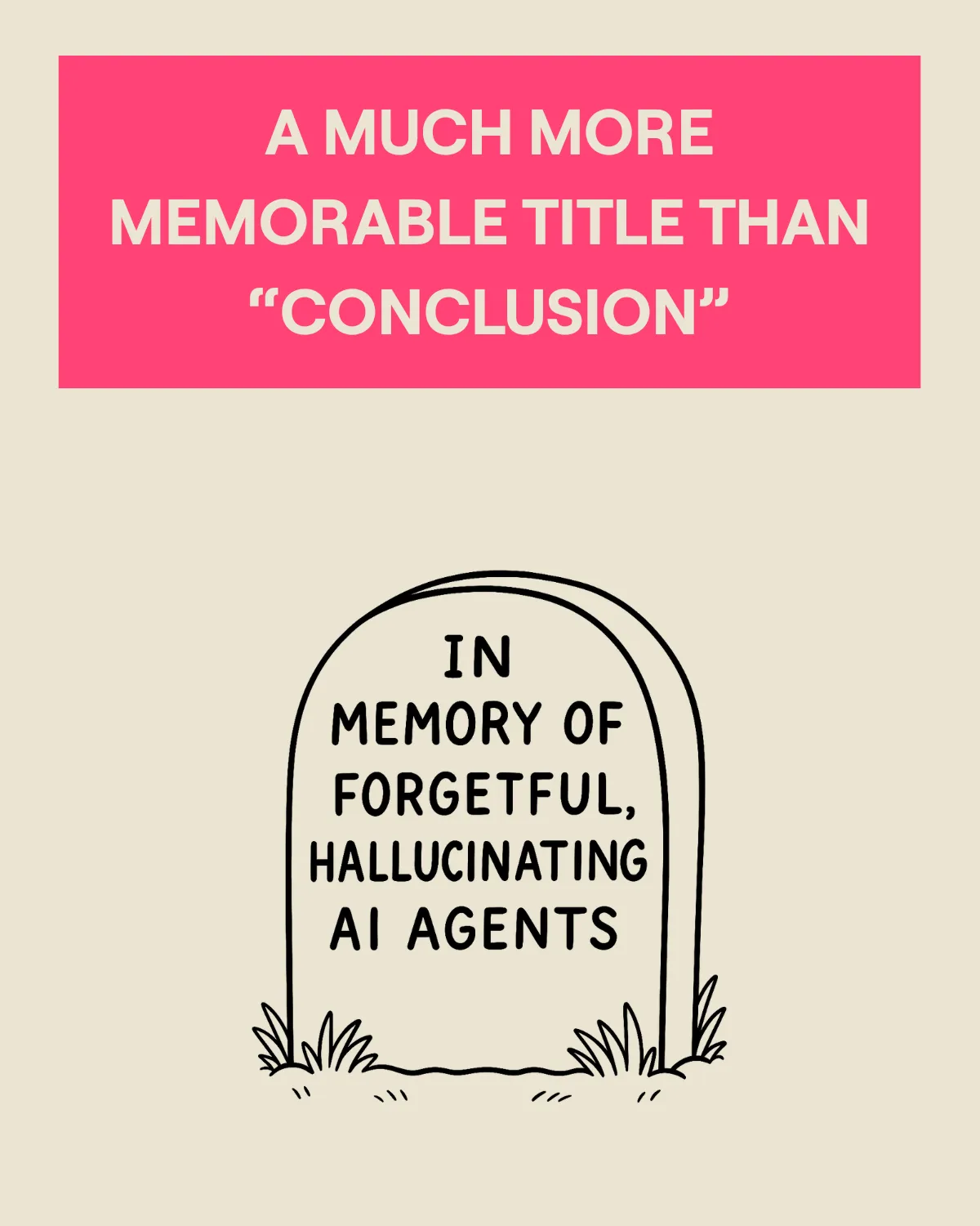Section titled “In Memory of… Forgetful, Hallucinating Agents?”While it seems trifle morbid to be ending things with a tombstone, it does seem fitting considering we’ve reached the end of our research report. We’re delighted to see the progress being made in the fields of context, memory, learning, accuracy and reliability of AI agents – everything from Google’s latest research on Nested Learning (to overcome issues around catastrophic forgetting, where learning new tasks sacrifices proficiency on old tasks) to Thinking Machines Lab’s work on Defeating Nondeterminism in LLM Inference. And of course, all the great work that startups mentioned in this article are doing. In the next part of our research series on Agentic Enablers, we’ll focus on startups who are making AI agents robust against unintended failure modes and malicious attacks, as well as managing authentication and authorisation for agents – see the link here.
