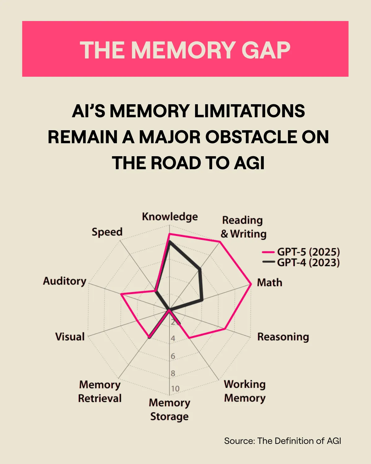 Section titled “Evolution: Better, More Capable AI”A recently published research paper on The Definition of AGI dissected general intelligence into ten core cognitive domains – including reasoning, memory, and perception. The findings were telling: While proficient in knowledge-intensive domains, current AI systems have critical deficits in foundational cognitive machinery, particularly memory. As the paper notes, “Without the ability to continually learn, AI systems suffer from ‘amnesia’ which limits their utility, forcing the AI to re-learn context in every interaction.” We’ve added a chart from the research paper which shows just how “jagged” and lopsided AI development has been to date.