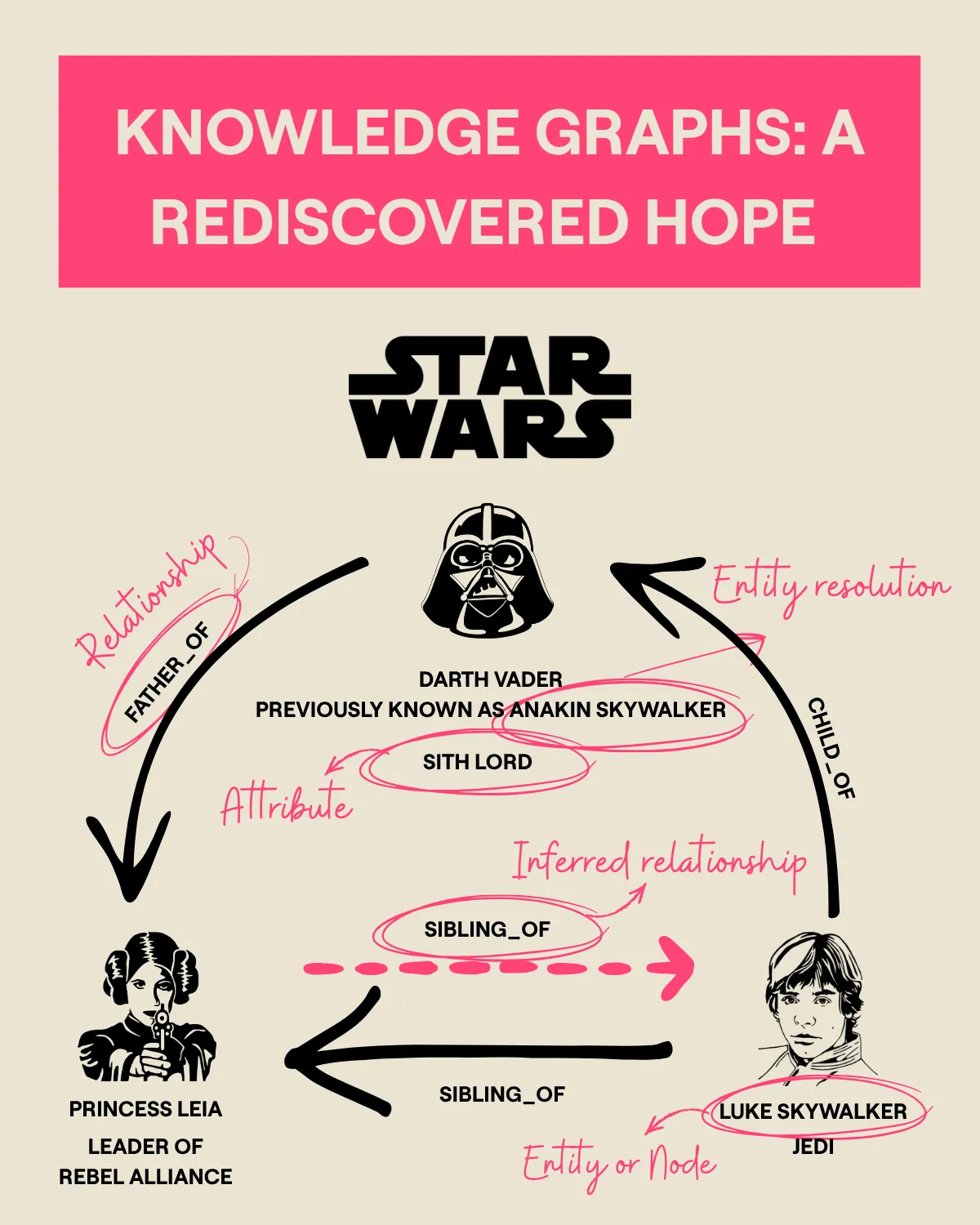 - Relationships (Edges) – e.g. Darth Vader → FatherOf → Luke Skywalker