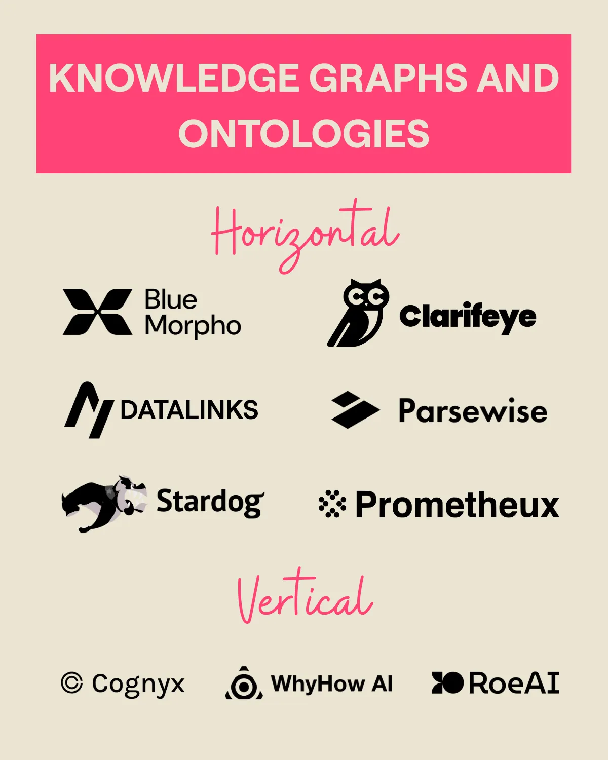 Section titled “Verticalisation Vs Horizontalisation”We’ve seen startups taking a horizontal approach (e.g. Blue Morpho, Cognee, Parsewise, Stardog, Prometheux, DataLinks, Clarifeye) catering to a variety of industries such as healthcare, finance, legal, defence, and others taking a verticalised approach (e.g. WhyHow.AI in legal, RoeAI in risk and compliance, and Cognyx in manufacturing). Even amongst those who take a verticalised approach, WhyHow and Roe started horizontally and pivoted to a specific vertical, while Cognyx began with a specific problem (“reinventing hardware engineering”) and decided that knowledge graphs were the best way to solve it.