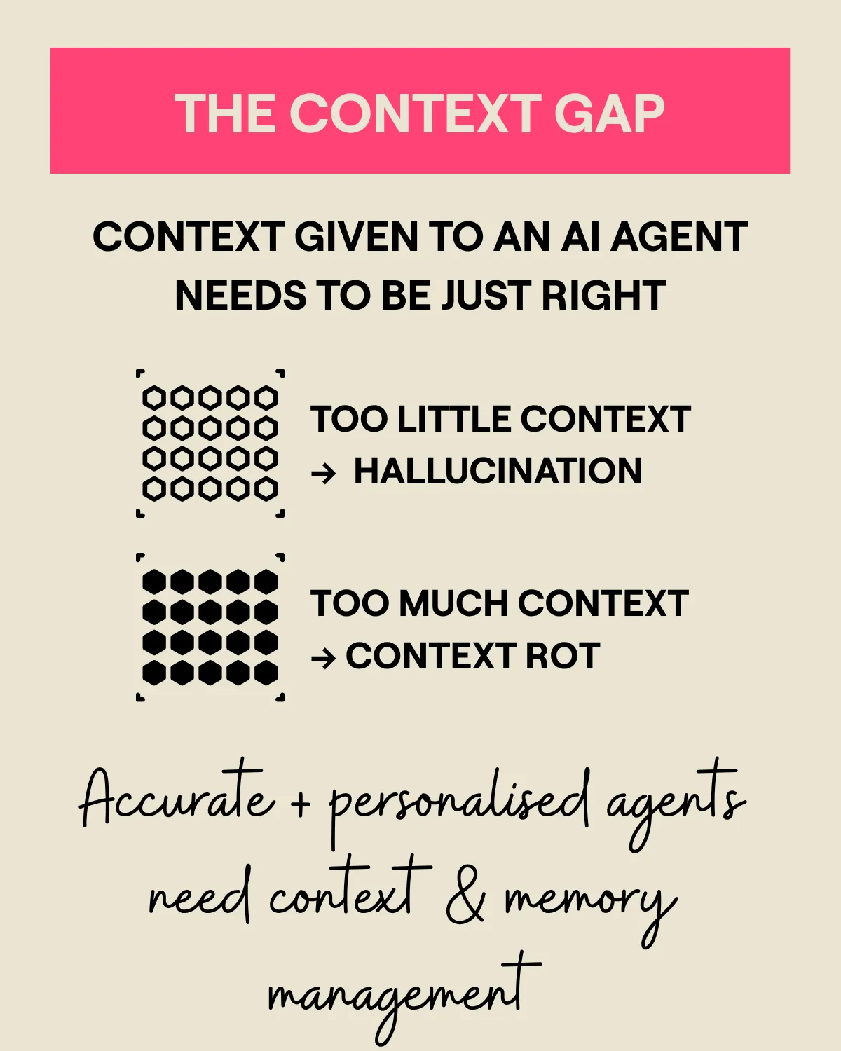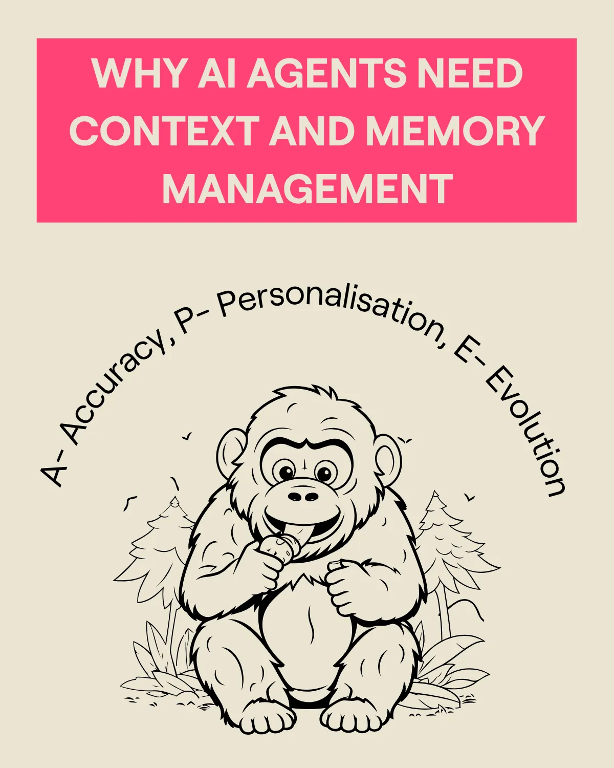 Section titled “What Are Context and Memory? And why Do We Need Them?”Context is an AI agent’s short-term working memory – it’s the immediate information available during inference, like computer RAM. It’s limited, costly to maintain, and resets between sessions, but directly shapes the model’s responses. Memory, on the other hand, is long-term storage – persistent information kept outside the model that must be retrieved to influence outputs. Memory is key because it enables AI agents to learn and improve over time, as they adapt their behaviour in response to accumulated experience. Given the focus of our research, here’s a fun mnemonic device to summarise why your AI agents need context and memory management: APE, which stands for A ccuracy, P ersonalisation, E volution.