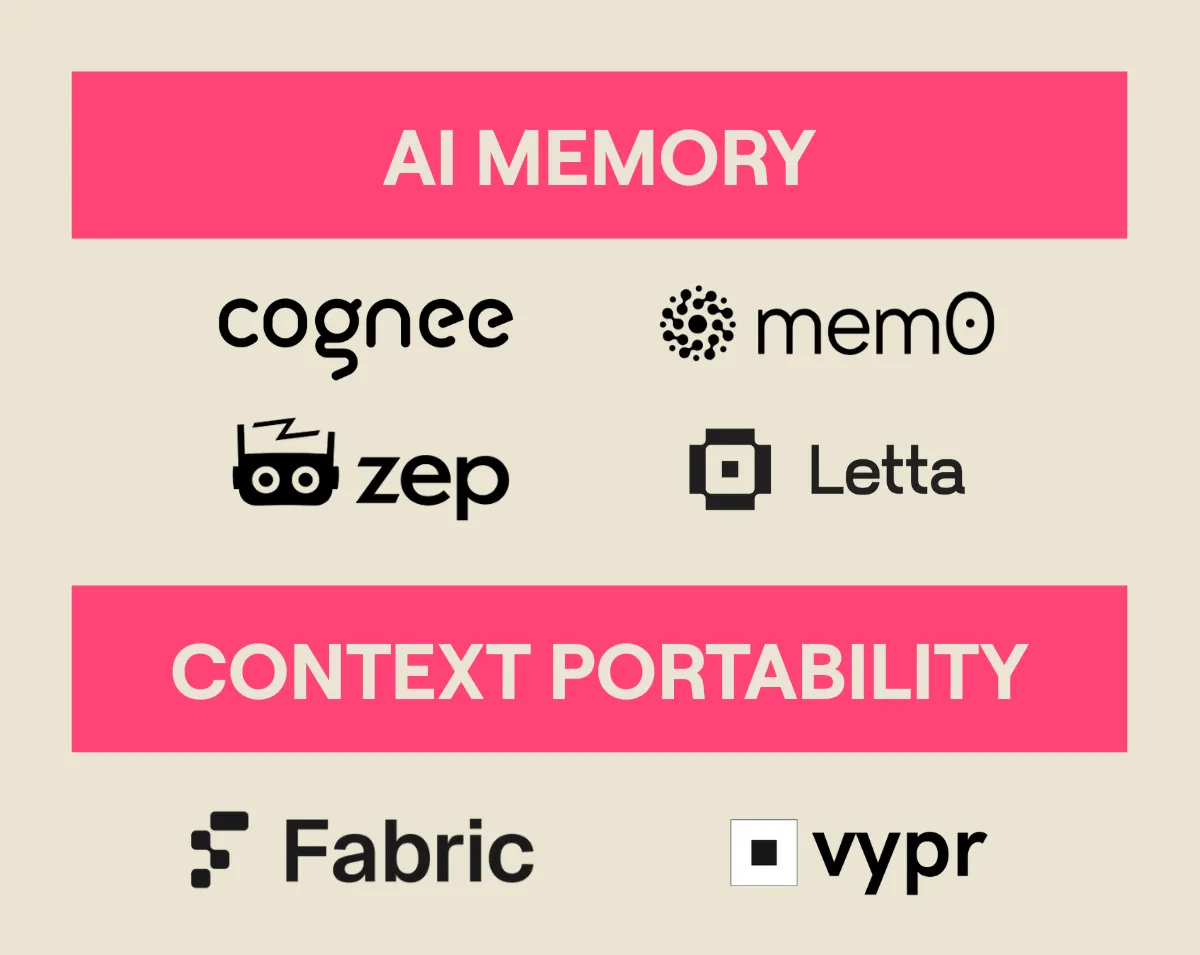This creates a Goldilocks problem: LLMs need context and memory that are precise, updated, and relevant – not too much and not too little – yet filtering, prioritising, and retaining exactly the right information is a notoriously hard balance to strike. This is exactly what practises like context engineering address, and the startups we talk about through the course of this report have made context engineering and memory management that much easier for us.