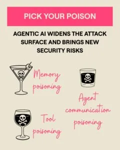 - interact with each other, which means they can reinforce each others’ problems or bad decisions, or communication channels between them could be tampered with (a.k.a agent communication poisoning)….with the end result that the attack surface is wider and the blast radius is larger.