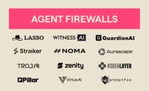 Section titled “Agent Firewalls”Agent firewalls are protective layers that monitor and control AI agents’ inputs, outputs, reasoning steps, and system-level behaviours to keep them safe and aligned. Beyond blocking prompt injection, data leakage, harmful content, or hallucinations, they inspect an agent’s intent, tool use, and autonomy in real time – detecting manipulation, preventing rogue actions, and ensuring that the agent continues to operate within its intended objectives. Startups in this space include Straiker, GuardionAI, Hidden Layer, Troj AI, Zenity, Lasso Security, Witness AI, Virtue AI, Noma Security, Promptfoo, Pillar Security and Aurascape.