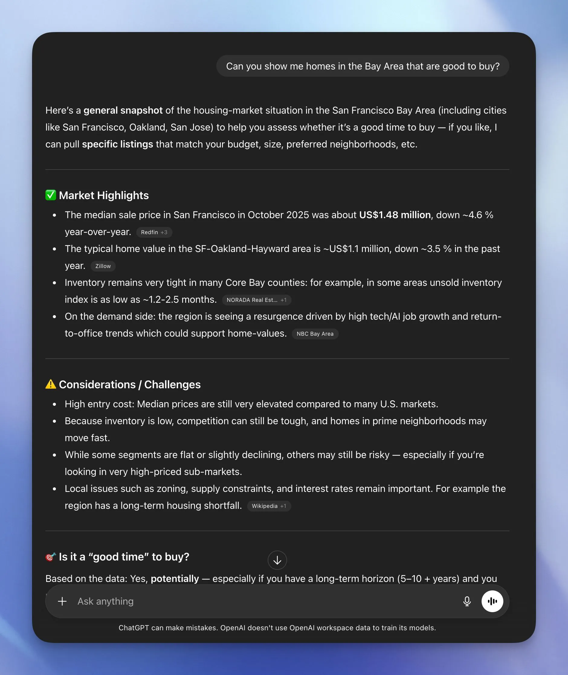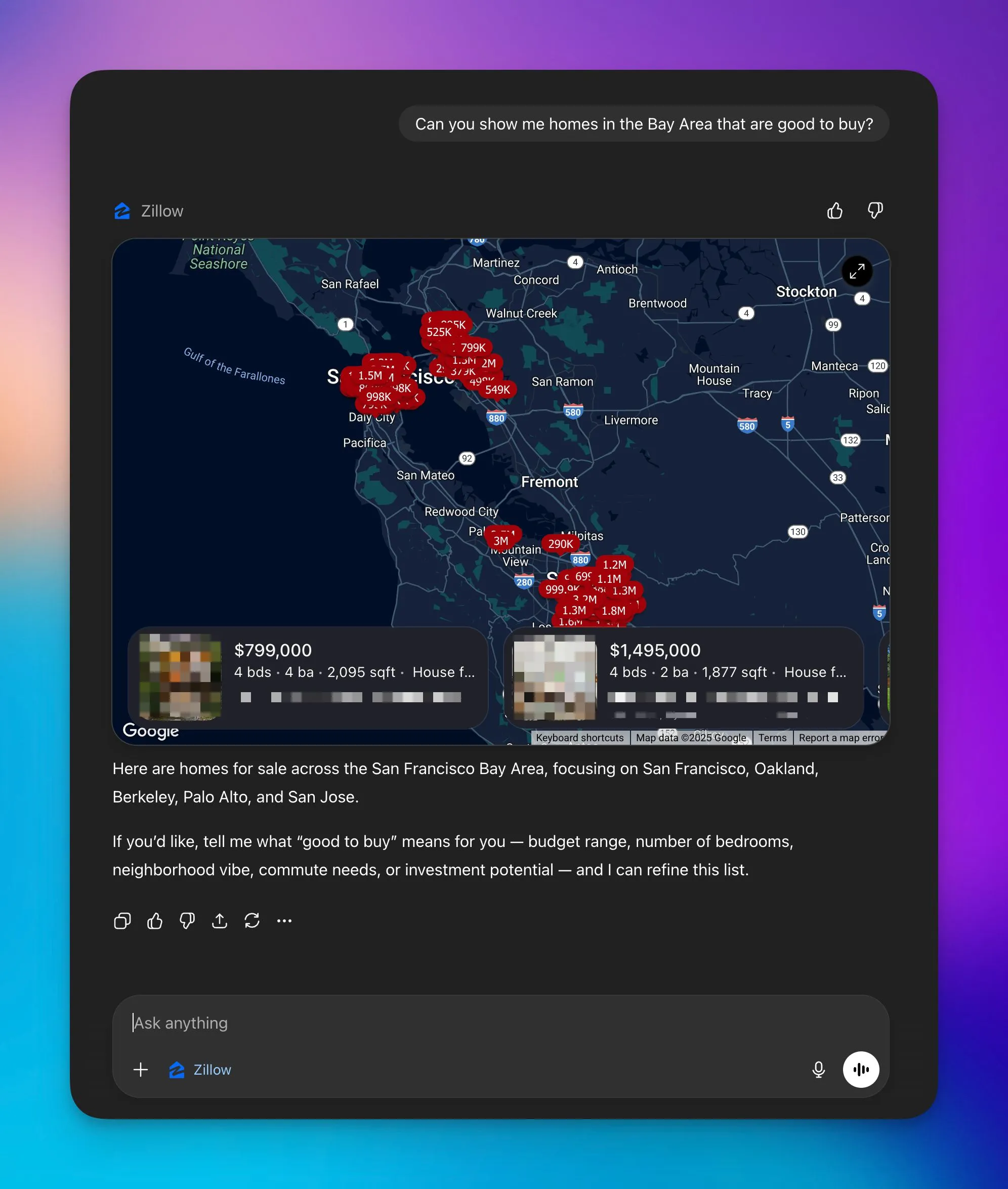 With the Zillow App, the user has full access to the model, plus the ability to search live property listings, filter by criteria, and view rich property details — all without leaving the chat.