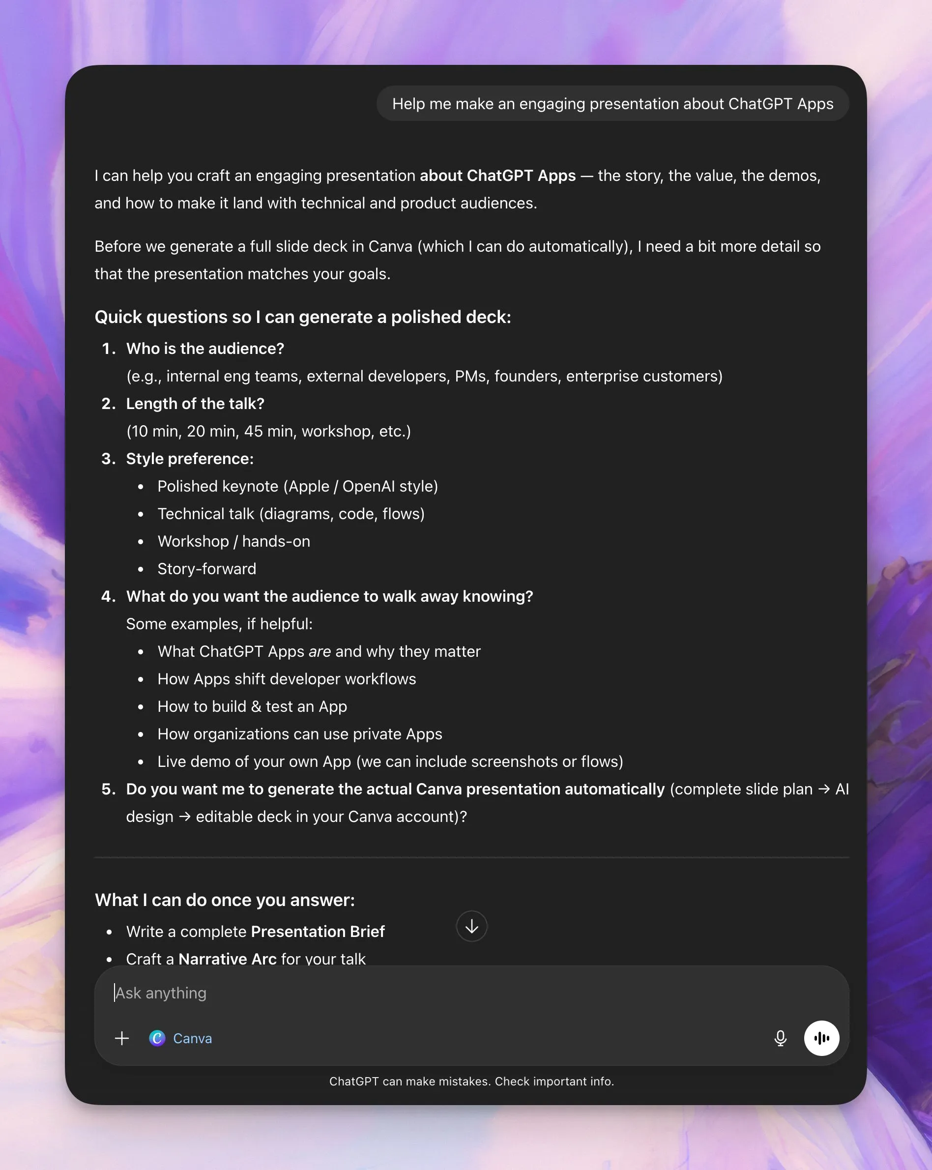 Building a full scale presentation requires context. The Canva app asks for follow up questions to get the user to synthesize what they’re looking to build.