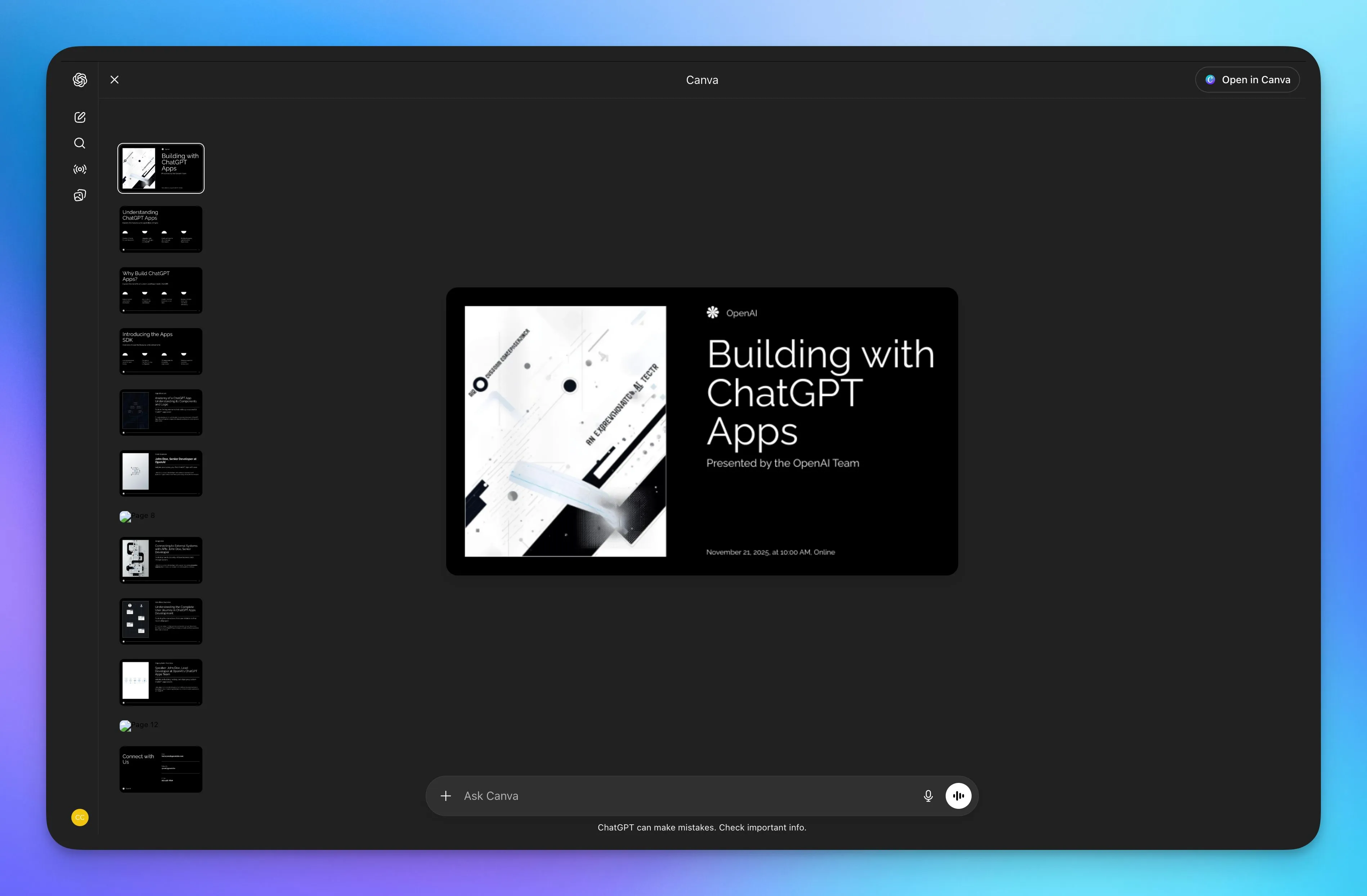 For example, the Canva app in ChatGPT can generate an entire presentation draft and the user can enter full screen mode that matches user expectations for navigating a slide deck, but deeper slide-by-slide editing still happens in the full Canva editor.