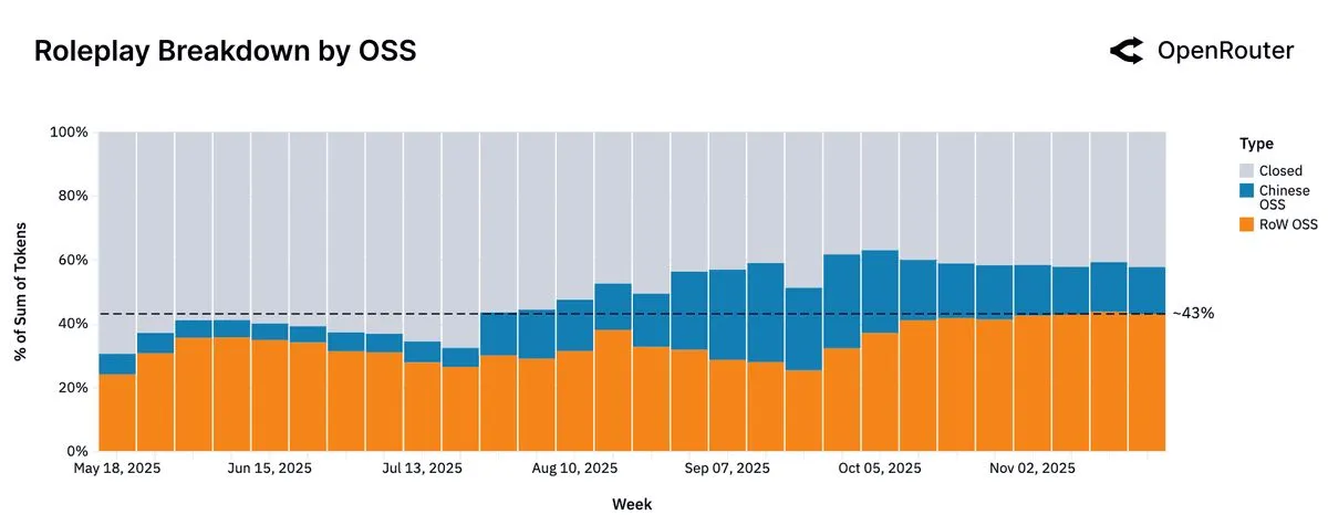 Section titled “What Are Open Source Models Used For?”Open-source models today are employed for a remarkably broad range of tasks, spanning creative, technical, and informational domains. While proprietary models still dominate in structured business tasks, OSS models have carved out leadership in two particular areas: creative roleplay and programming assistance. Together, these categories account for the majority of OSS token usage.