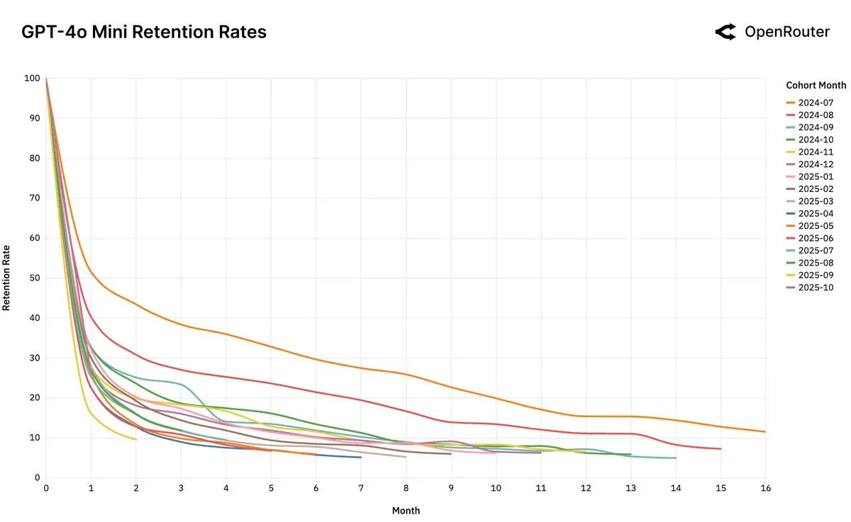 The Dominant Launch Anomaly. The OpenAI GPT-4o Mini chart shows this phenomenon in its extreme. A single foundational cohort (July 2024, orange line) established a dominant, sticky workload-model fit at launch. All subsequent cohorts, which arrived after this fit was established and the market had moved on, behave identically: they churn and cluster at the bottom. This suggests the window to establish this foundational fit is singular and occurs only at the moment a model is perceived as “frontier.”