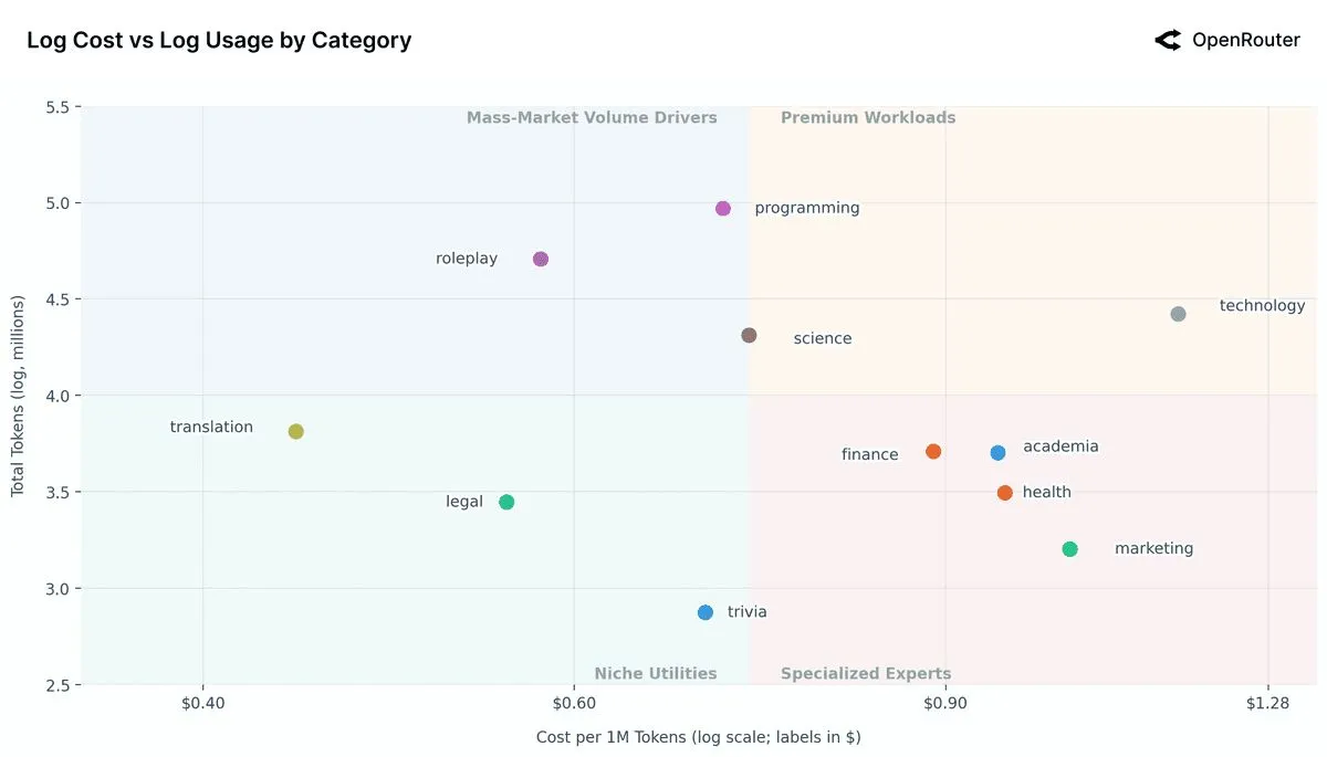 Specialized Experts (Bottom-Right): This quadrant houses lower-volume, high-cost applications, including finance, academia,health, and marketing. These are high-stakes, niche professional domains. The lower aggregate volume is logical, as one might consult an AI for “health” or “finance” far less frequently than for “programming.” Users are willing to pay a significant premium for these tasks, likely because the demand for accuracy, reliability, and domain-specific knowledge is extremely high.