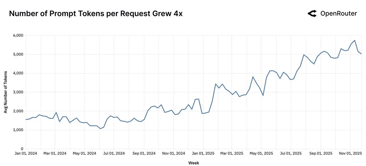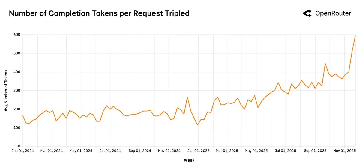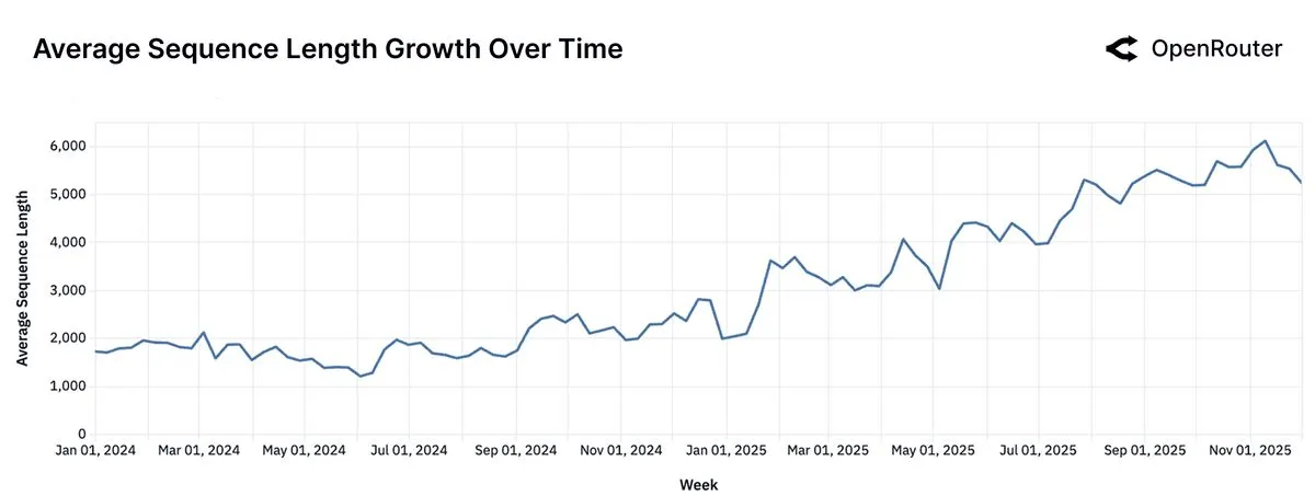 Sequence length is a proxy for task complexity and interaction depth. The figure above shows that average sequence length has more than tripled over the past 20 months from under 2,000 tokens in late 2023 to over 5,400 by late 2025. This growth reflects a structural shift toward longer context windows, deeper task history, and more elaborate completions.