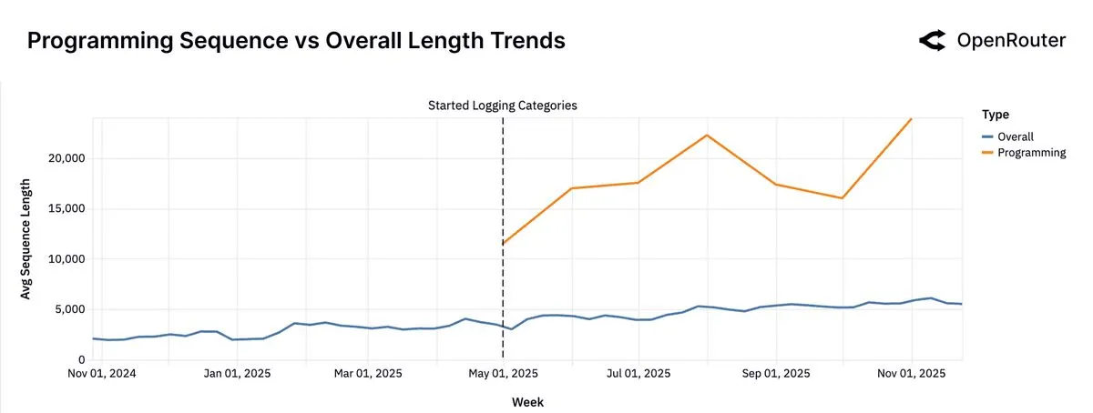 As per previous section, the second figure adds further clarity: programming-related prompts now average 3–4 times the token length of general-purpose prompts. The divergence indicates that software development workflows are the primary driver of longer interactions. Long sequences are not just user verbosity: they are a signature of embedded, more sophisticated agentic workflows.