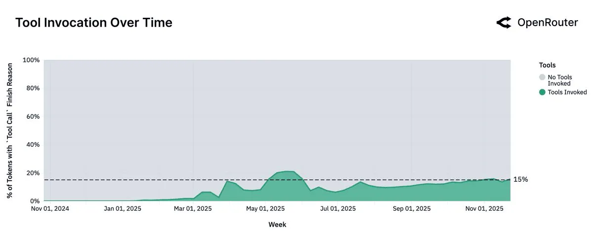 Section titled “Implications: Agentic Inference Is the New Default”Together, these trends (rising reasoning share, expanded tool use, longer sequences, and programming’s outsize complexity) suggest that the center of gravity in LLM usage has shifted. The median LLM request is no longer a simple question or isolated instruction. Instead, it is part of a structured, agent-like loop, invoking external tools, reasoning over state, and persisting across longer contexts.