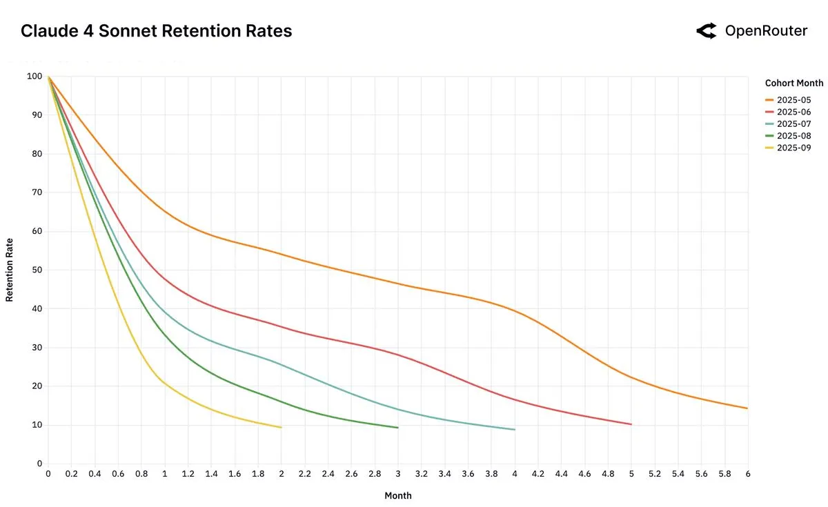 Empirically, this pattern is observable in the June 2025 cohort of Gemini 2.5 Pro and the May 2025 cohort of Claude 4 Sonnet, which retain approximately 40% of users at Month 5, substantially higher than later cohorts. These cohorts appear to correspond to specific technical breakthroughs (e.g., reasoning fidelity or tool-use stability) that finally enabled previously impossible workloads.
