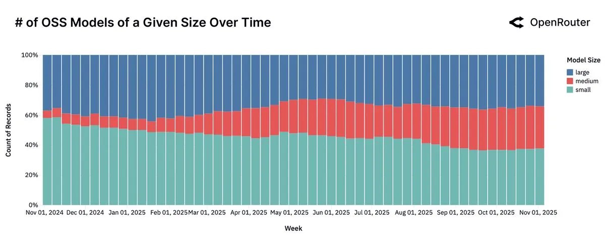 The era of small models dominating the open source ecosystem might be behind. The market is now bifurcating, with users either gravitating toward a new, robust class of medium models, or consolidating their workloads onto the single most capable large model.