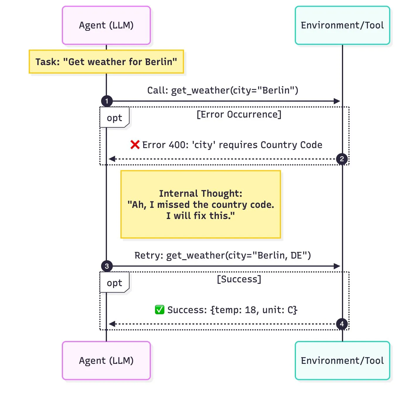 An error is just another input. Instead of crashing, we catch the error, feed it back to the agent, and try to recover.