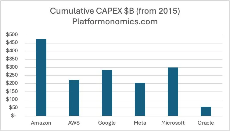 Over the last three years, Oracle has spent between 2 of CAPEX per dollar of cloud infrastructure revenue. AWS CAPEX historically has been between 25 to 60% of revenue (and is ramping back up as they deploy AI infrastructure).