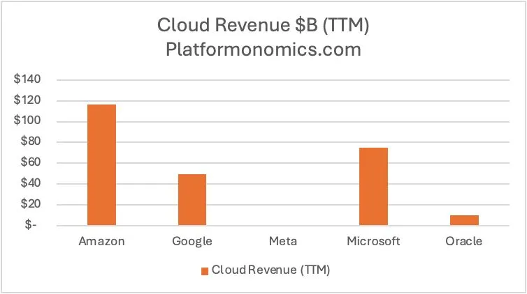 Bar graph comparing cloud revenue (TTM in billions) of major companies including Amazon, Google, Meta, Microsoft, and Oracle.